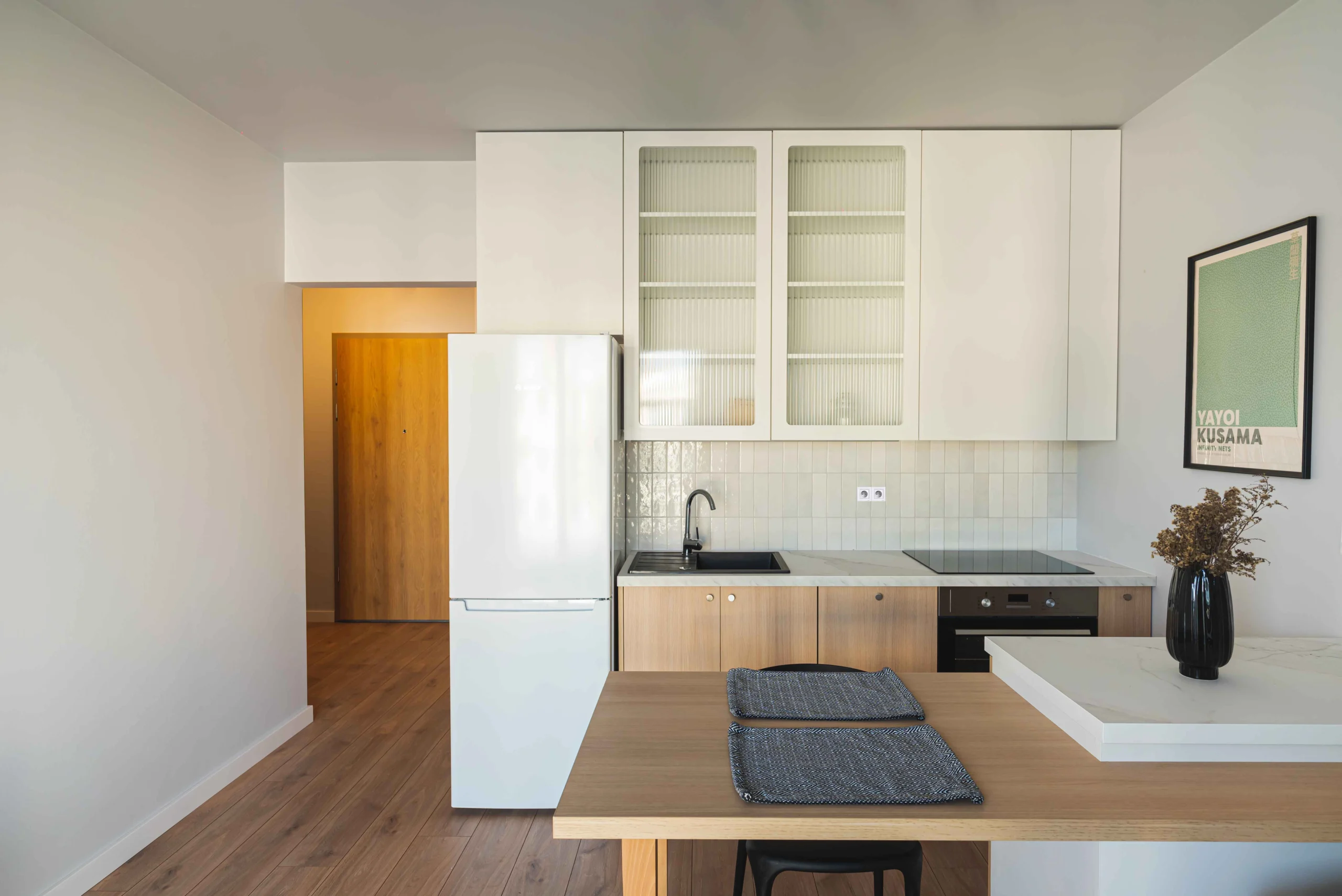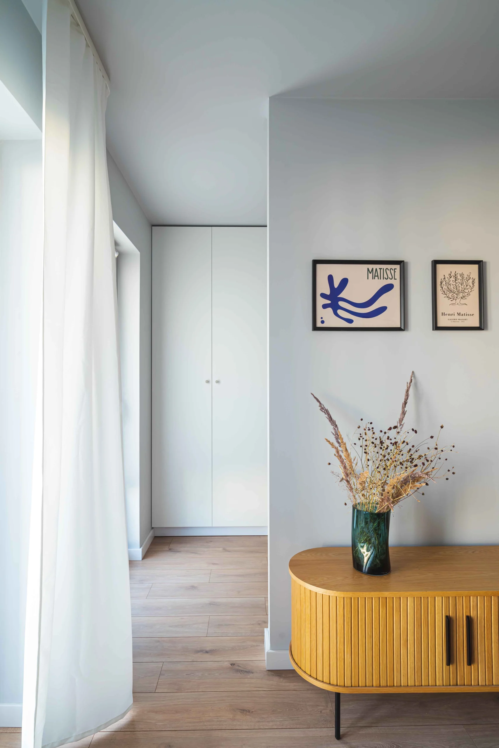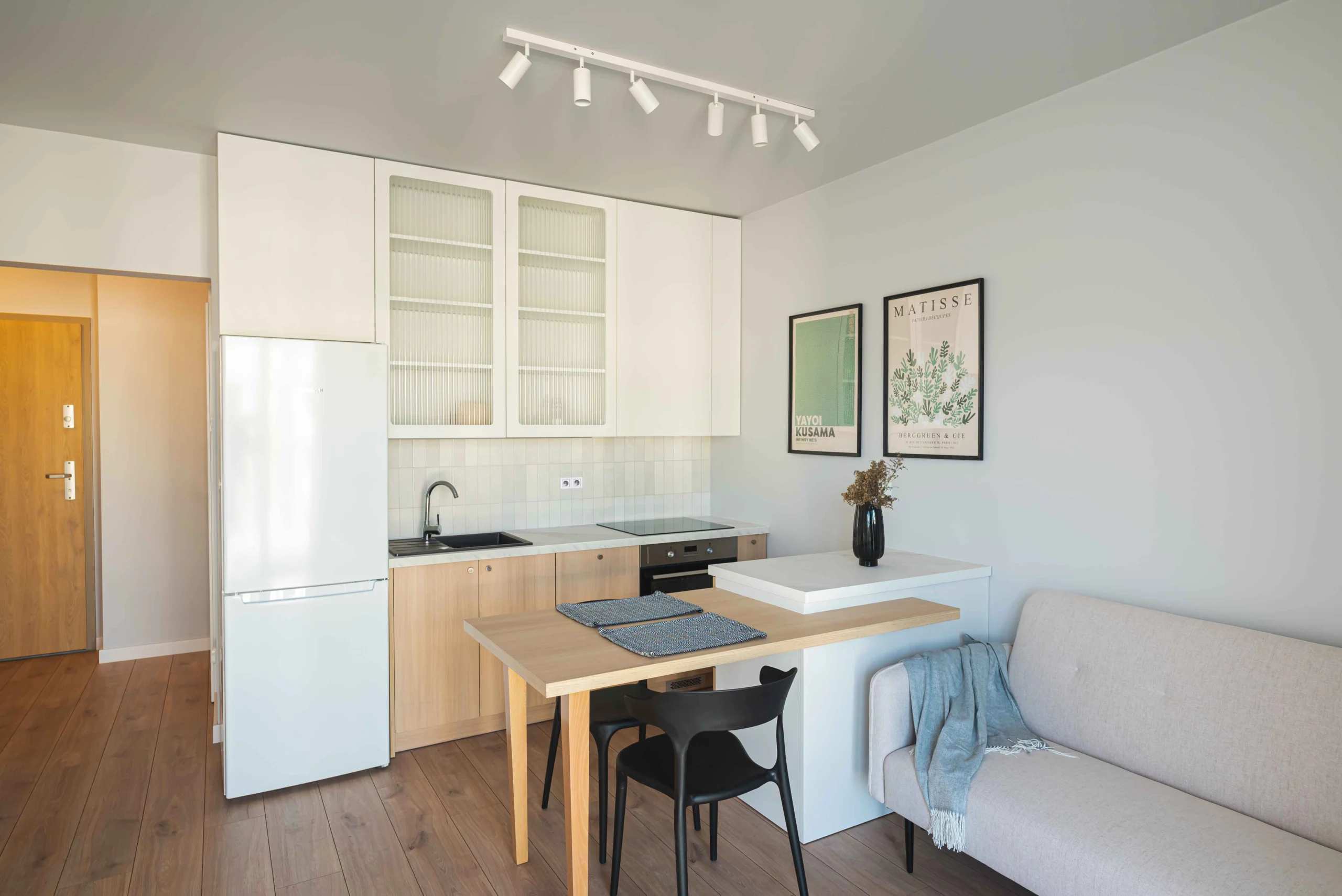 Projekt kawalerki stworzony z myślą o sprzedaży, w którym minimalistyczne, jasne przestrzenie harmonijnie łączą się z naturalnym drewnem. Przemyślany z uwzględnieniem niższego budżetu, promuje przytulność i funkcjonalność.