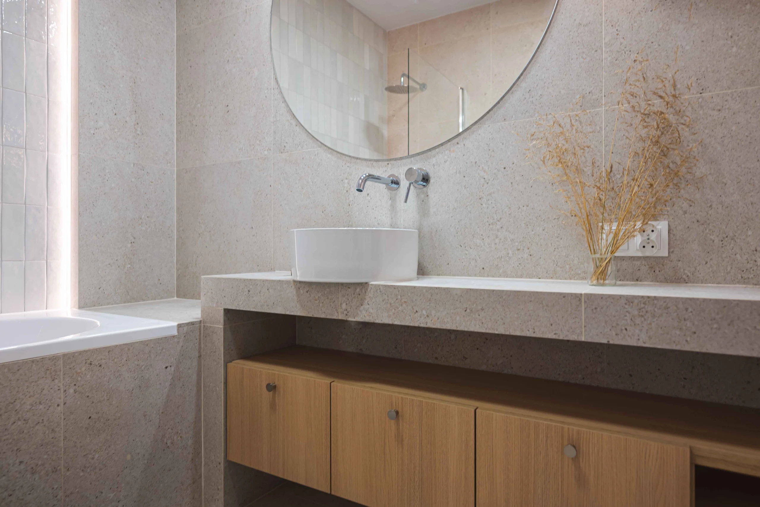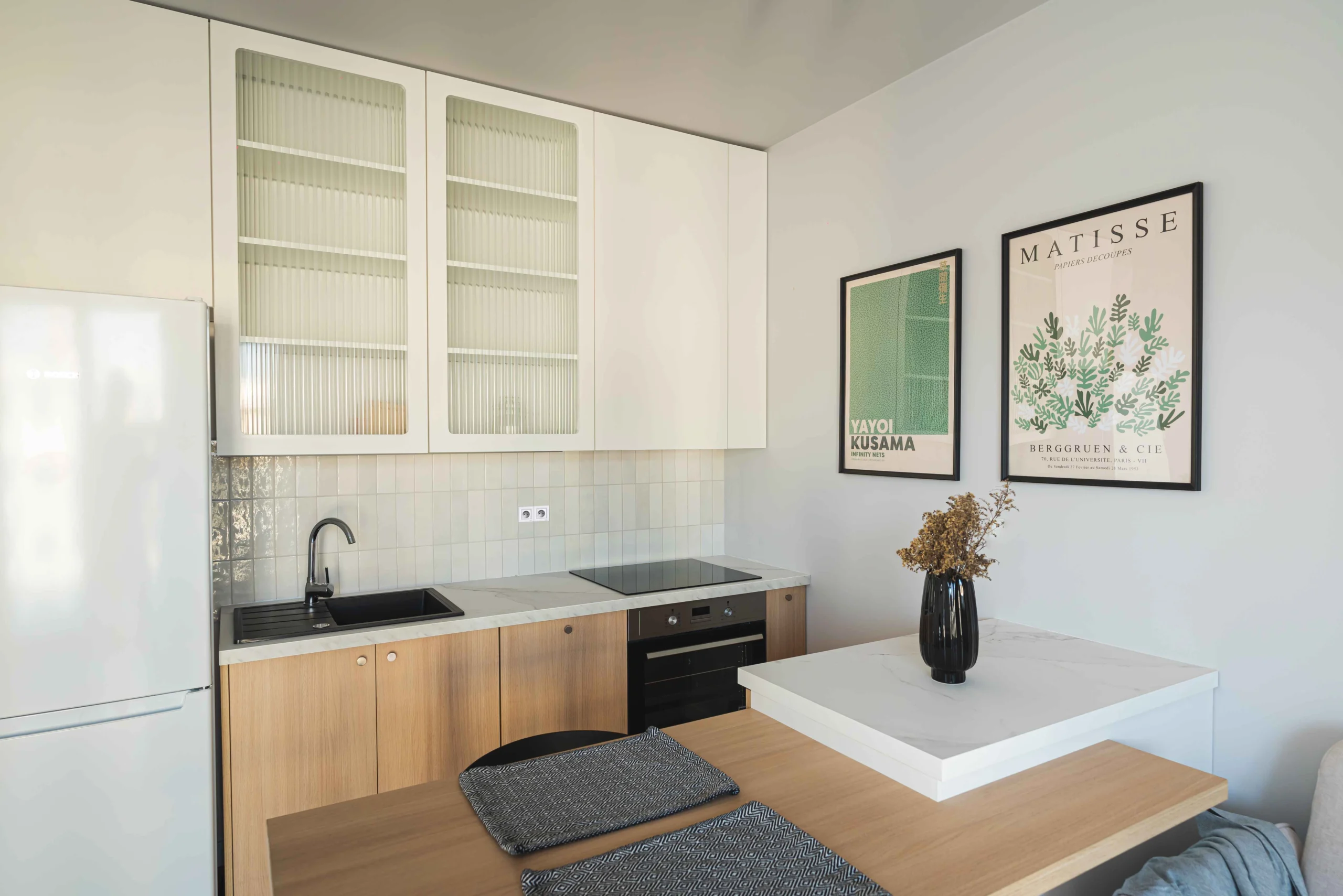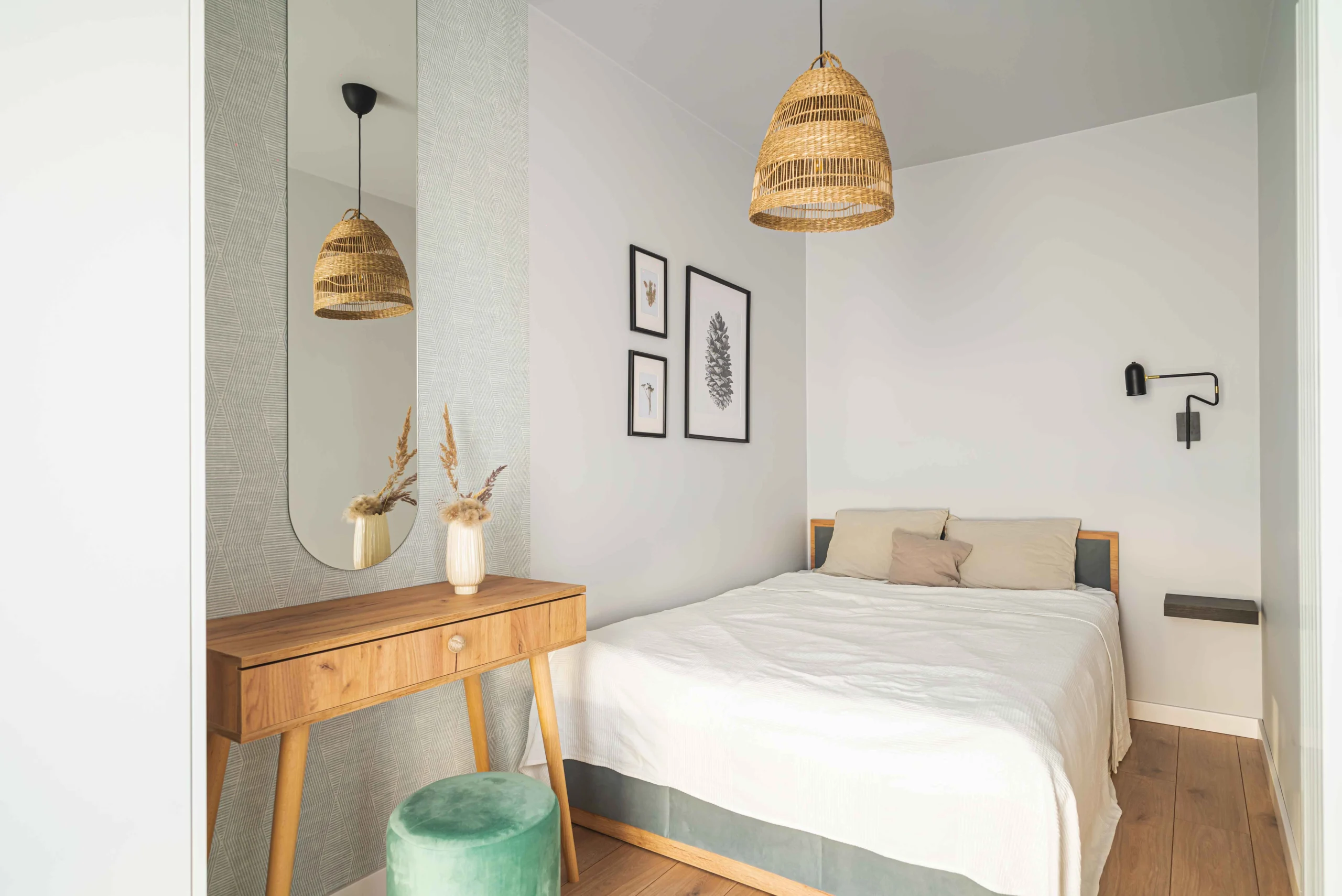 Projekt kawalerki stworzony z myślą o sprzedaży, w którym minimalistyczne, jasne przestrzenie harmonijnie łączą się z naturalnym drewnem. Przemyślany z uwzględnieniem niższego budżetu, promuje przytulność i funkcjonalność.