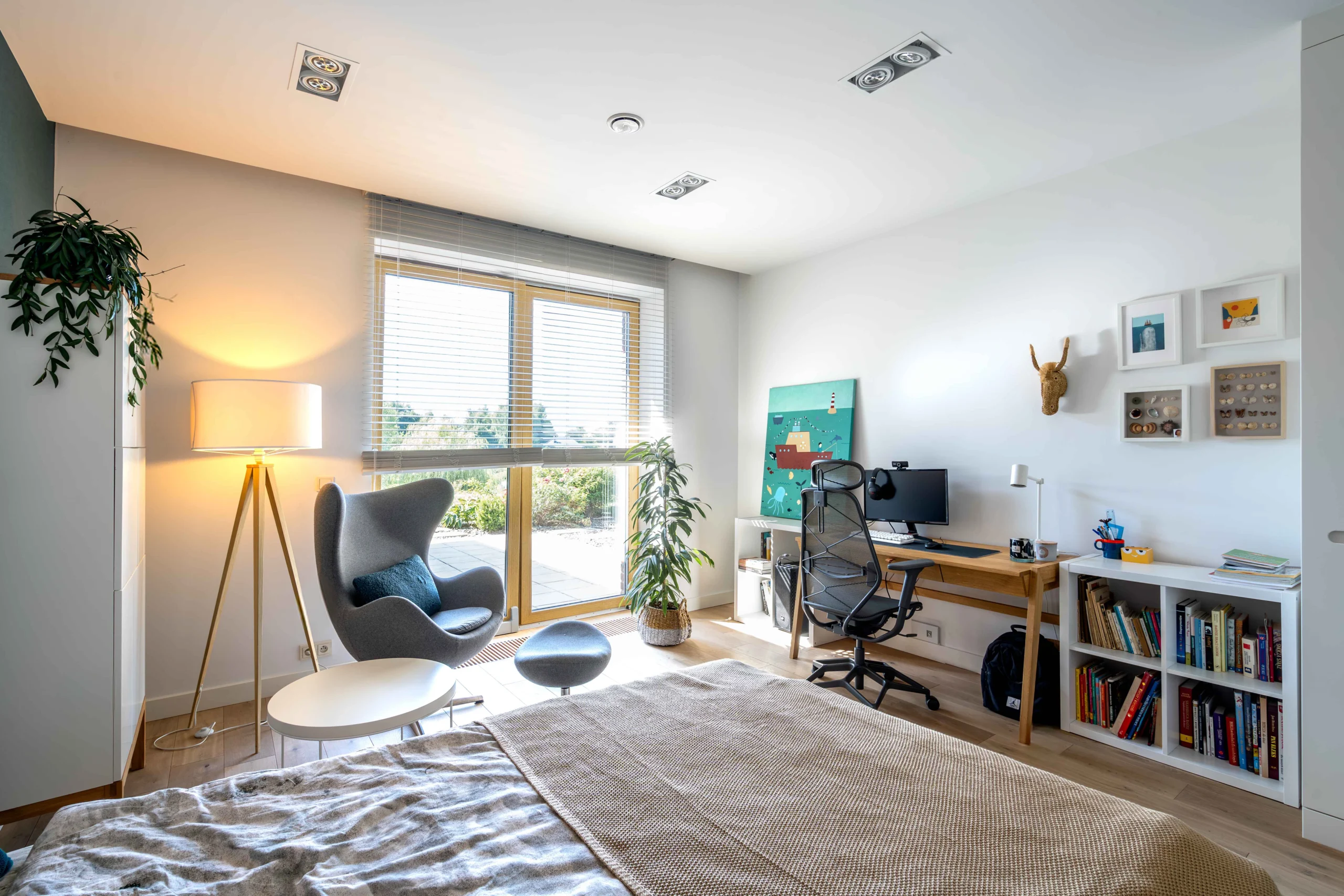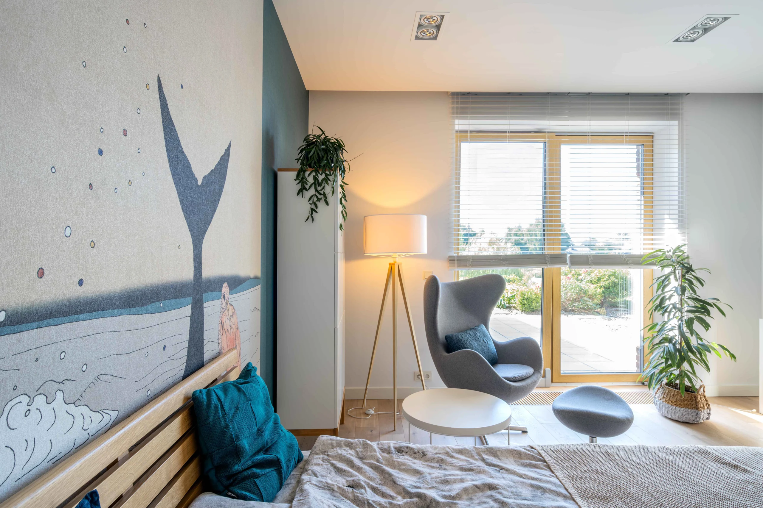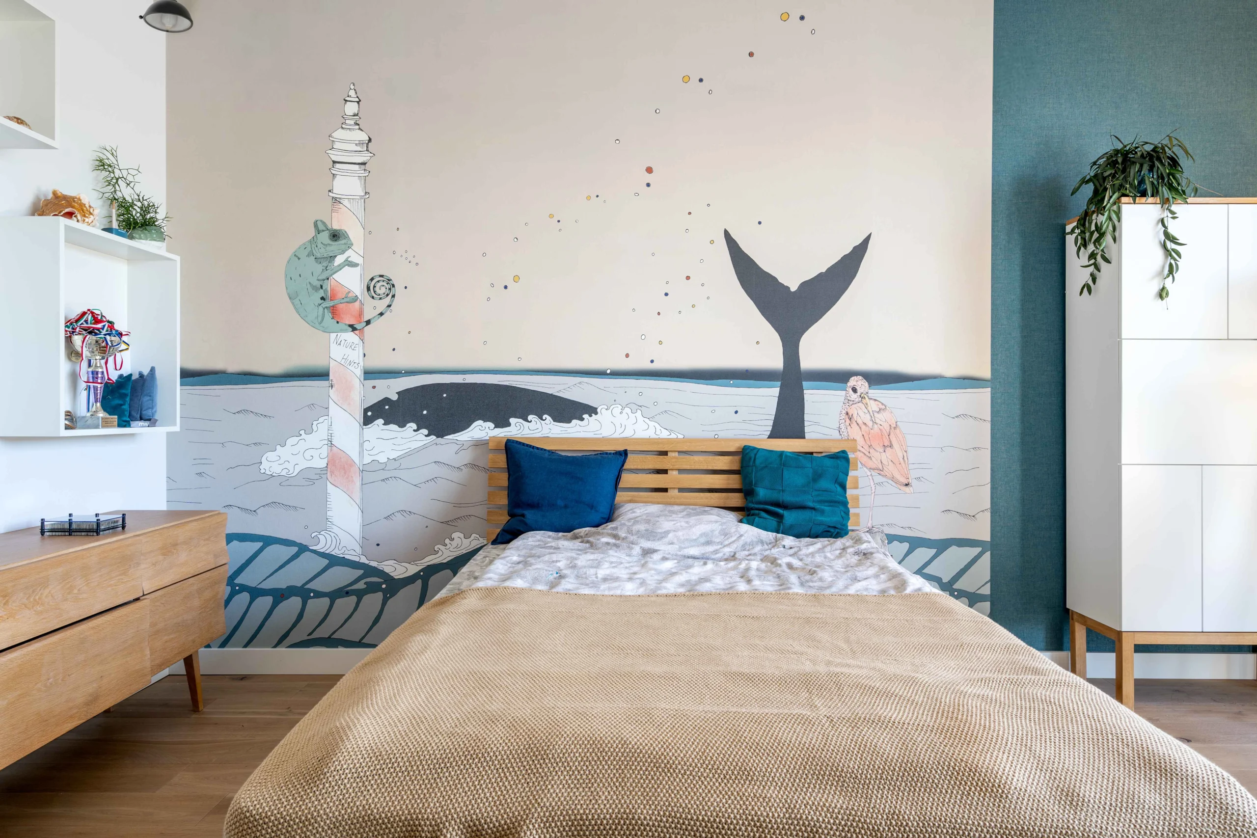 Kreatywna przestrzeń marzeń Projekt pokoju dla nastolatka, w którym fototapeta staje się kluczowym elementem wystroju. Stonowana kolorystyka i dynamiczny akcent pozwalają na odpoczynek oraz wyzwolenie kreatywności.